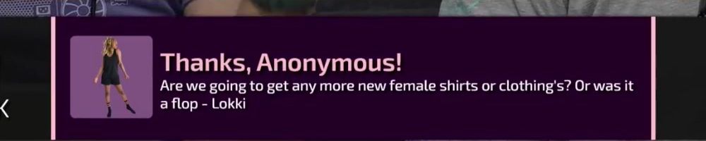 Thanks, Anonymous! Are we going to get any more new female shirts or clothing's? Or was it a flop - Lokki