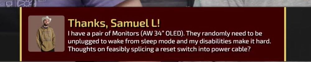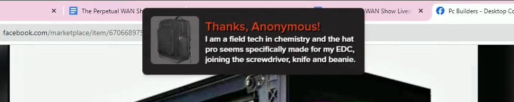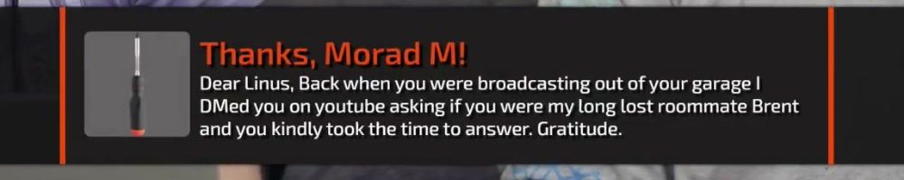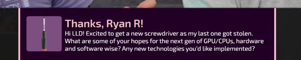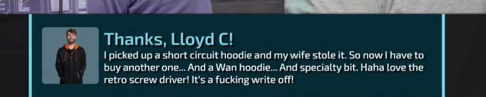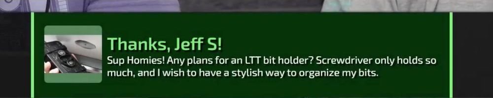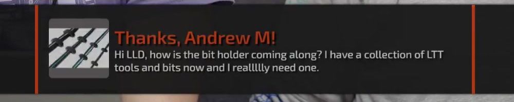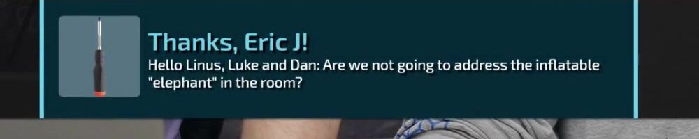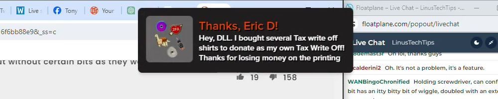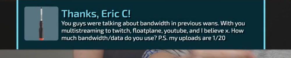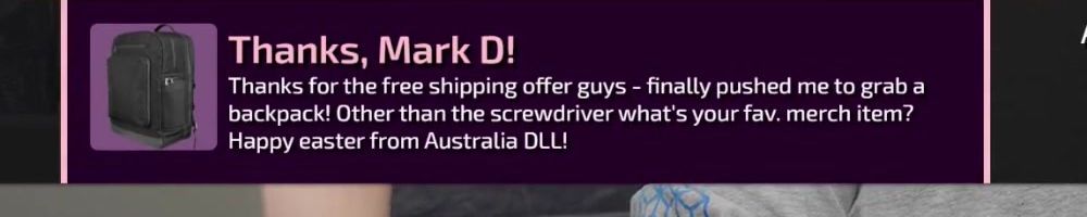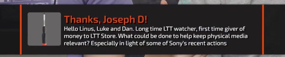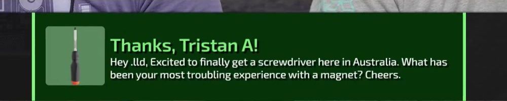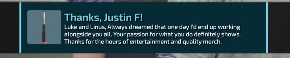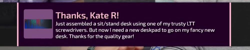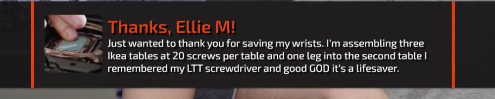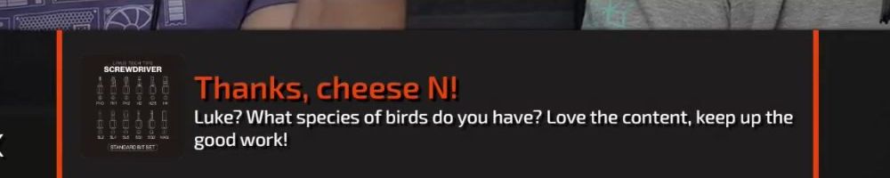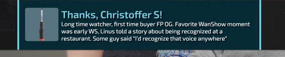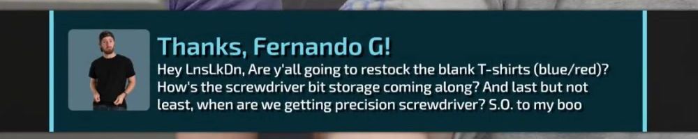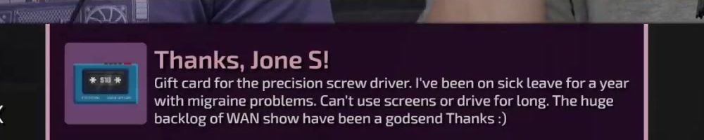 Thanks, Jone S! Gift card for the precision screw driver. I've been on sick leave for a year with migraine problems. Can't use screens or drive for long. The huge backlog of WAN show have been a godsend Thanks :)
