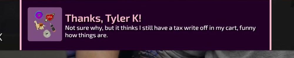 Thanks, Tyler K! Not sure why, but it thinks I still have a tax write off in my cart, funny how things are.