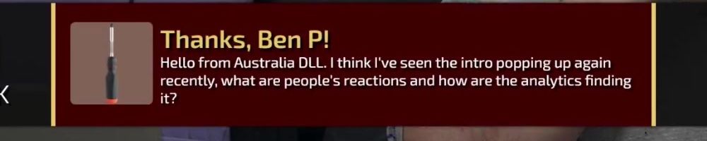 Thanks, Ben P! Hello from Australia DLL. I think I've seen the intro popping up again recently, what are people's reactions and how are the analytics finding it?