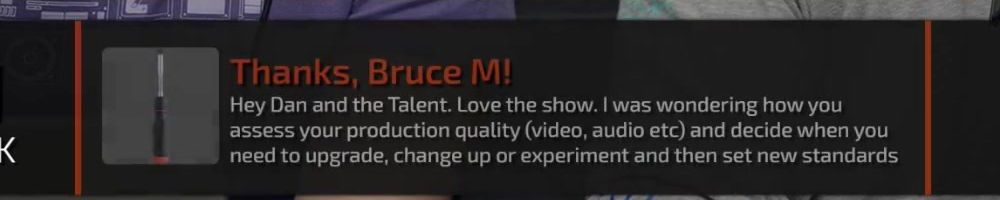 Thanks, Bruce M! Hey Dan and the Talent. Love the show. I was wondering how you assess your production quality (video, audio etc) and decide when you need to upgrade, change up or experiment and then set new standards