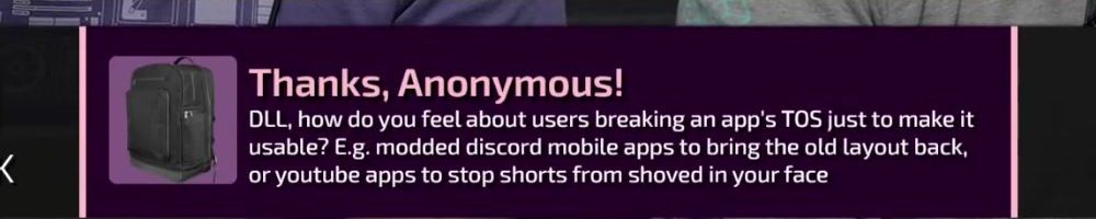 Thanks, Anonymous! DLL, how do you feel about users breaking an app's TOS just to make it usable? E.g. modded discord mobile apps to bring the old layout back, or youtube apps to stop shorts from shoved in your face
