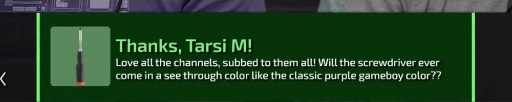 Thanks, Tarsi M! Love all the channels, subbed to them all! Will the screwdriver ever come in a see through color like the classic purple gameboy color??