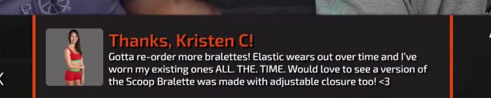 Thanks, Kristen C! Gotta re-order more bralettes! Elastic wears out over time and I've worn my existing ones ALL. THE. TIME. Would love to see a version of the Scoop Bralette was made with adjustable closure too! <3