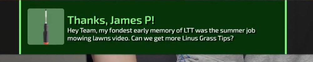 Thanks, James P! Hey Team, my fondest early memory of LTT was the summer job mowing lawns video. Can we get more Linus Grass Tips?