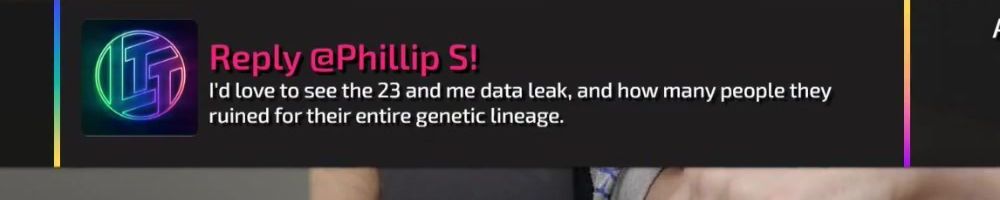 Reply @Phillip S! I'd love to see the 23 and me data leak, and how many people they ruined for their entire genetic lineage.