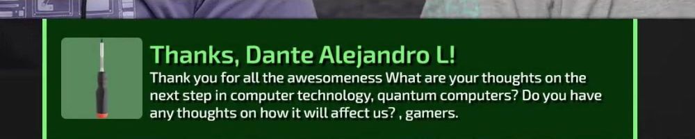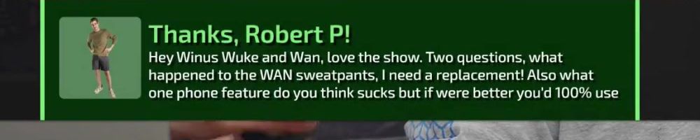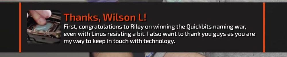 Thanks, Wilson L! First, congratulations to Riley on winning the Quickbits naming war, even with Linus resisting a bit. I also want to thank you guys as you are my way to keep in touch with technology.