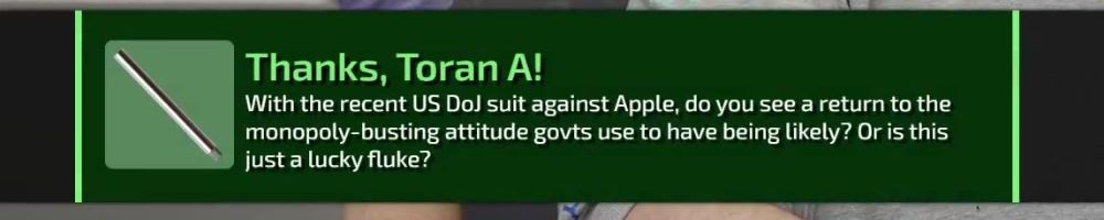 Thanks, Toran A! With the recent US DoJ suit against Apple, do you see a return to the monopoly-busting attitude govts use to have being likely? Or is this just a lucky fluke?