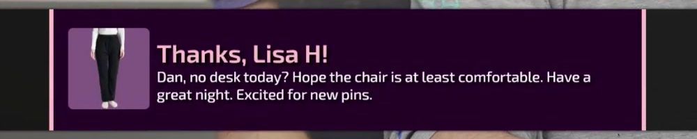 Thanks, Lisa H! Dan, no desk today? Hope the chair is at least comfortable. Have a great night. Excited for new pins.