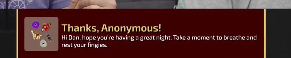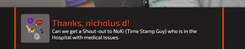 Thanks, nicholus d! Can we get a Shout-out to NoKi (Time Stamp Guy) who is in the Hospital with medical issues.