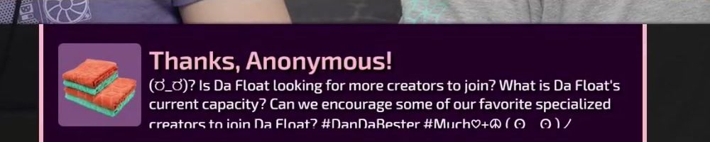 Thanks, Anonymous! (̄̿_̑)? Is Da Float looking for more creators to join? What is Da Float's current capacity? Can we encourage some of our favorite specialized creators to inin Da Float? #DanDaBester #Much♡+Φ ( ◌ ̄) /