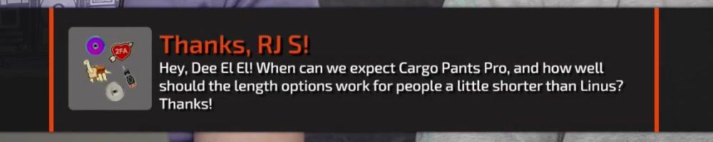 Thanks, RJ S! Hey, Dee EL El! When can we expect Cargo Pants Pro, and how well should the length options work for people a little shorter than Linus? Thanks!