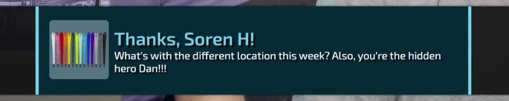 Thanks, Soren H! What's with the different location this week? Also, you're the hidden hero Dan!!!