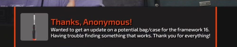 Thanks, Anonymous! Wanted to get an update on a potential bag/case for the framework 16. Having trouble finding something that works. Thank you for everything!