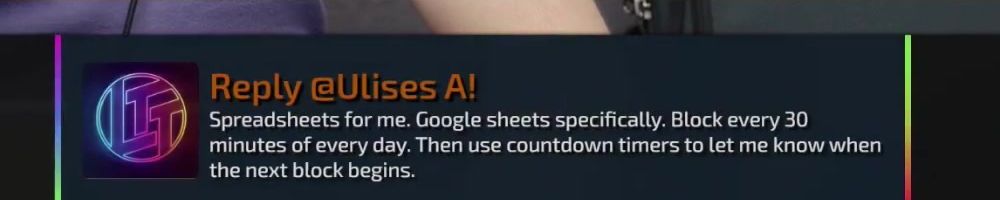 Reply @Ulises A! Spreadsheets for me. Google sheets specifically. Block every 30 minutes of every day. Then use countdown timers to let me know when the next block begins.