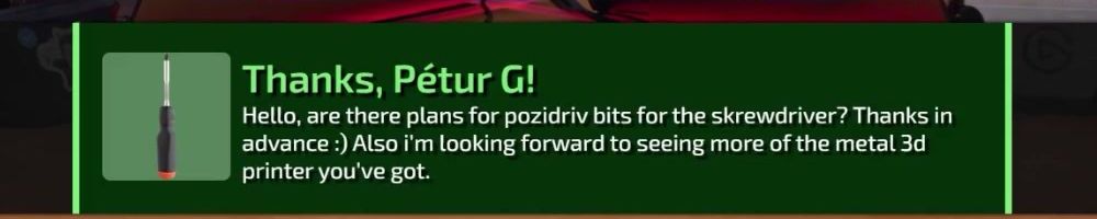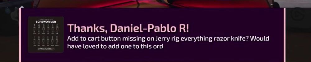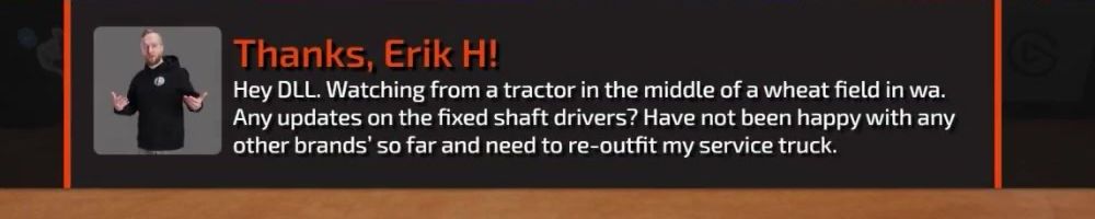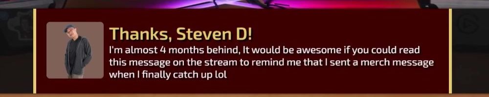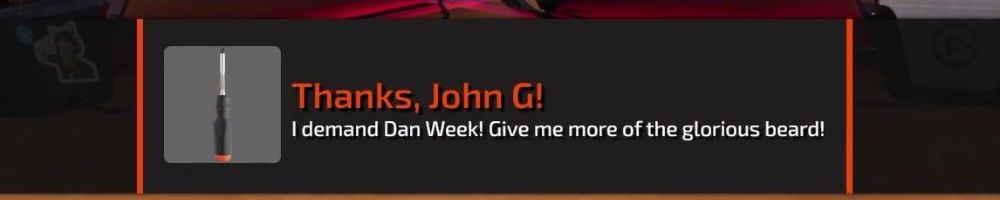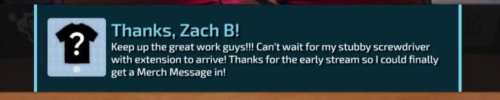 Keep up the great work guys!!! Can't wait for my stubby screwdriver with extension to arrive! Thanks for the early stream so I could finally get a Merch Message in!
