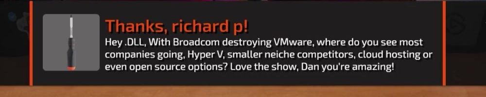 Hey .DLL, With Broadcom destroying VMware, where do you see most companies going, Hyper V, smaller neiche competitors, cloud hosting or even open source options? Love the show, Dan you're amazing!