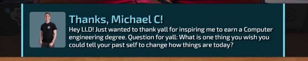 Hey LLD! Just wanted to thank yall for inspiring me to earn a Computer engineering degree. Question for yall: What is one thing you wish you could tell your past self to change how things are today?