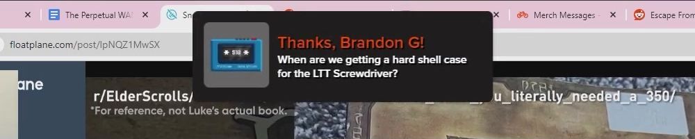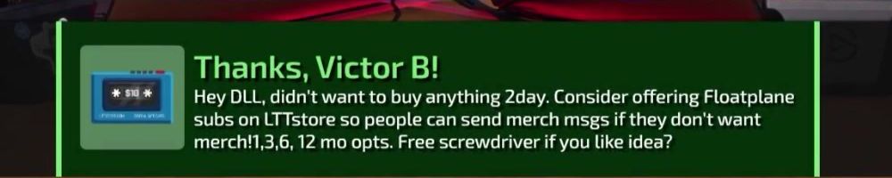 Hey DLL, didn't want to buy anything 2day. Consider offering Floatplane subs on LTTstore so people can send merch msgs if they don't want merch!1,3,6, 12 mo opts. Free screwdriver if you like idea?