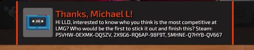 Hi LLD, interested to know who you think is the most competitive at LMG? Who would be the first to stick it out and finish this? Steam: PSVHW-0EXMK-DQ52ZV, 2X9G6-RQ6AP-98F9T, 5MHNE-Q7HYB-QV667