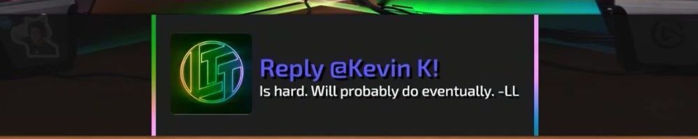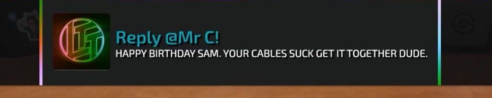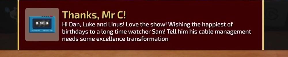 Hi Dan, Luke and Linus! Love the show! Wishing the happiest of birthdays to a long time watcher Sam! Tell him his cable management needs some excellence transformation