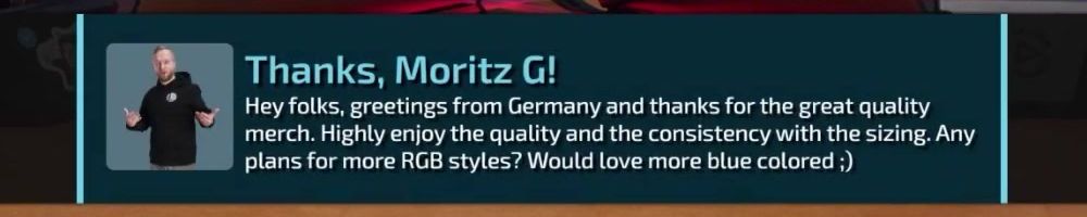 Hey folks, greetings from Germany and thanks for the great quality merch. Highly enjoy the quality and the consistency with the sizing. Any plans for more RGB styles? Would love more blue colored ;)