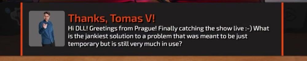 Hi DLL! Greetings from Prague! Finally catching the show live :-) What is the jankiest solution to a problem that was meant to be just temporary but is still very much in use?