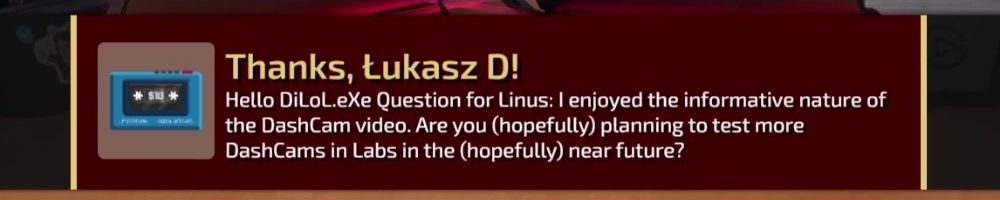 Hello DiLoL.eXe Question for Linus: I enjoyed the informative nature of the DashCam video. Are you (hopefully) planning to test more DashCams in Labs in the (hopefully) near future?