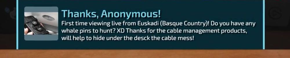 First time viewing live from Euskadi (Basque Country)! Do you have any whale pins to hunt? XD Thanks for the cable management products, will help to hide under the desck the cable mess!