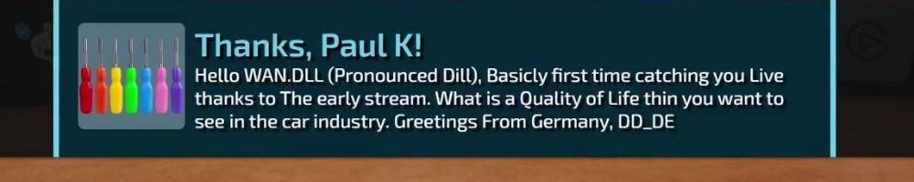 Hello WAN.DLL (Pronounced Dill), Basicly first time catching you Live thanks to The early stream. What is a Quality of Life thin you want to see in the car industry. Greetings From Germany, DD_DE