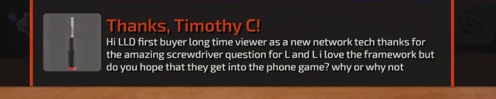 Hi LLD first buyer long time viewer as a new network tech thanks for the amazing screwdriver question for L and I i love the framework but do you hope that they get into the phone game? why or why not