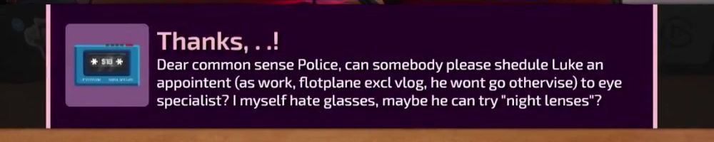 Dear common sense Police, can somebody please shedule Luke an appointent (as work, flotplane excl vlog, he wont go othervise) to eye specialist? I myself hate glasses, maybe he can try "night lenses"?