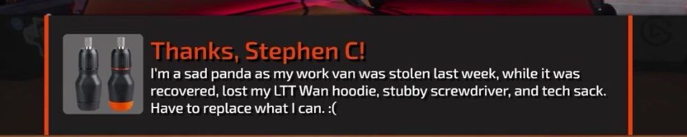 I'm a sad panda as my work van was stolen last week, while it was recovered, lost my LTT Wan hoodie, stubby screwdriver, and tech sack. Have to replace what I can. :(