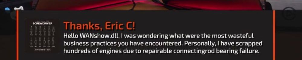 Hello WANshow.dll, I was wondering what were the most wasteful business practices you have encountered. Personally, I have scrapped hundreds of engines due to repairable connecting rod bearing failure.