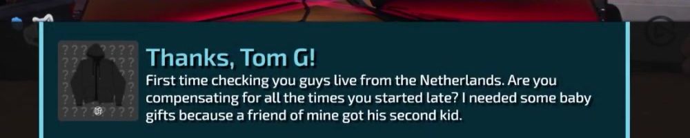 First time checking you guys live from the Netherlands. Are you compensating for all the times you started late? I needed some baby gifts because a friend of mine got his second kid.