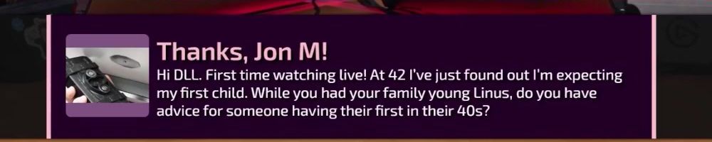 Hi DLL. First time watching live! At 42 I've just found out I'm expecting my first child. While you had your family young Linus, do you have advice for someone having their first in their 40s?