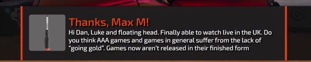 Hi Dan, Luke and floating head. Finally able to watch live in the UK. Do you think AAA games and games in general suffer from the lack of "going gold". Games now aren't released in their finished form