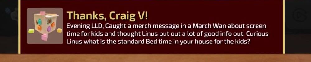 Evening LLD, Caught a merch message in a March Wan about screen time for kids and thought Linus put out a lot of good info out. Curious Linus what is the standard Bed time in your house for the kids?