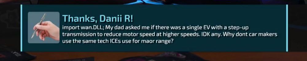import wan.DLL; My dad asked me if there was a single EV with a step-up transmission to reduce motor speed at higher speeds. IDK any. Why dont car makers use the same tech ICEs use for maor range?