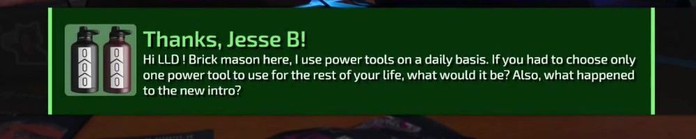 Hi LLD ! Brick mason here, I use power tools on a daily basis. If you had to choose only one power tool to use for the rest of your life, what would it be? Also, what happened to the new intro?