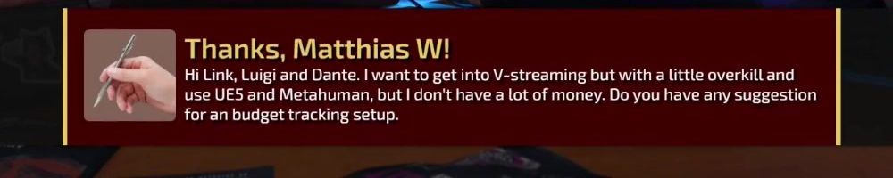 Hi Link, Luigi and Dante. I want to get into V-streaming but with a little overkill and use UES and Metahuman, but I don't have a lot of money. Do you have any suggestion for an budget tracking setup.