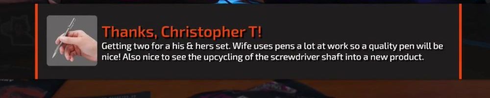 Getting two for a his & hers set. Wife uses pens a lot at work so a quality pen will be nice! Also nice to see the upcycling of the screwdriver shaft into a new product.