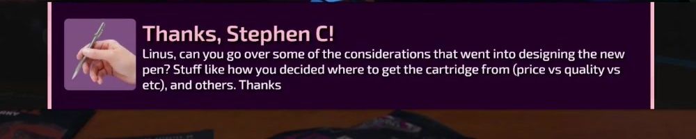 Linus, can you go over some of the considerations that went into designing the new pen? Stuff like how you decided where to get the cartridge from (price vs quality vs etc), and others. Thanks