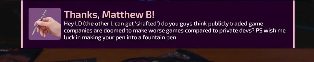 Hey LD (the other L can get 'shafted') do you guys think publicly traded game companies are doomed to make worse games compared to private devs? PS wish me luck in making your pen into a fountain pen