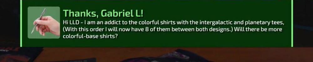 Hi LLD - I am an addict to the colorful shirts with the intergalactic and planetary tees,