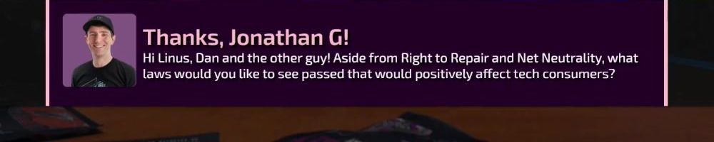 Hi Linus, Dan and the other guy! Aside from Right to Repair and Net Neutrality, what laws would you like to see passed that would positively affect tech consumers?