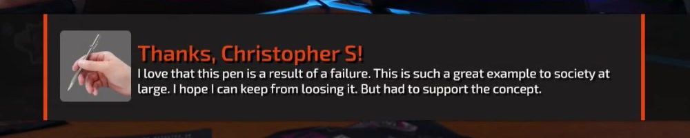 I love that this pen is a result of a failure. This is such a great example to society at large. I hope I can keep from loosing it. But had to support the concept.