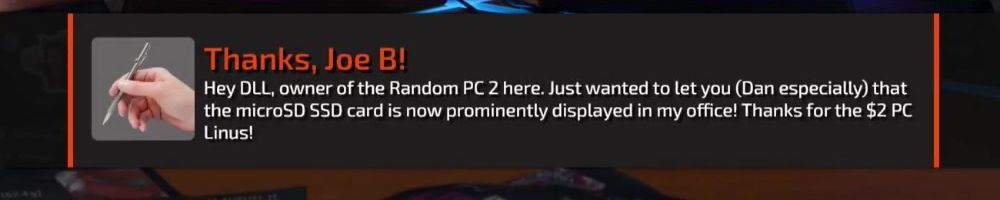 Hey DLL, owner of the Random PC 2 here. Just wanted to let you (Dan especially) that the microSD SSD card is now prominently displayed in my office! Thanks for the $2 PC Linus!