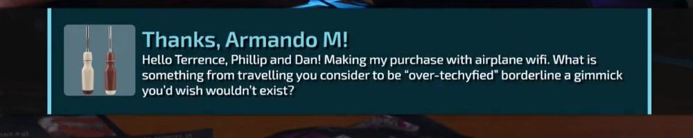 Hello Terrence, Phillip and Dan! Making my purchase with airplane wifi. What is something from travelling you consider to be “over-techyfied" borderline a gimmick you'd wish wouldn't exist?