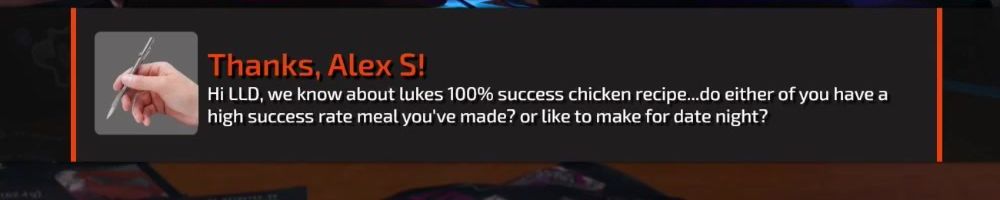 Hi LLD, we know about lukes 100% success chicken recipe...do either of you have a high success rate meal you've made? or like to make for date night?